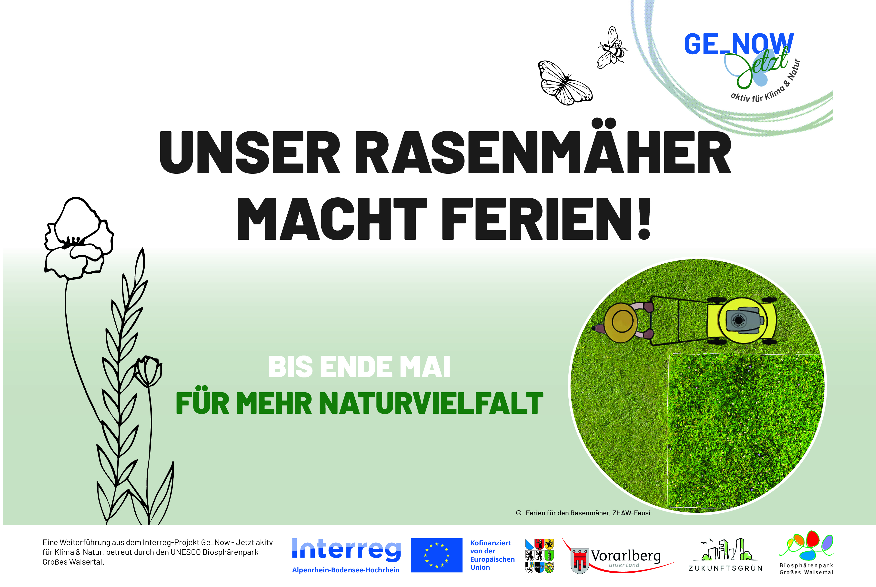 Die Aktion „Ferien für den Rasenmäher“ wurde im Jahr 2025 erstmals mit grossem Erfolg im Rahmen des grenzübergreifenden Interreg-Projekts GE_NOW organisiert. Rund 430 Teilnehmende – 82 davon aus der Region Prättigau/Davos – hatten ihre Rasenmäher stehen gelassen oder nur eingeschränkt genutzt. Zum Abschluss des Interreg-Projekts wird „Ferien für den Rasenmäher“ nun noch einmal durchgeführt, angeführt vom Vorarlberger Projektpartner Biosphärenpark Grosses Walsertal. Dies auch mit der Absicht, die Aktion langfristig zu etablieren.